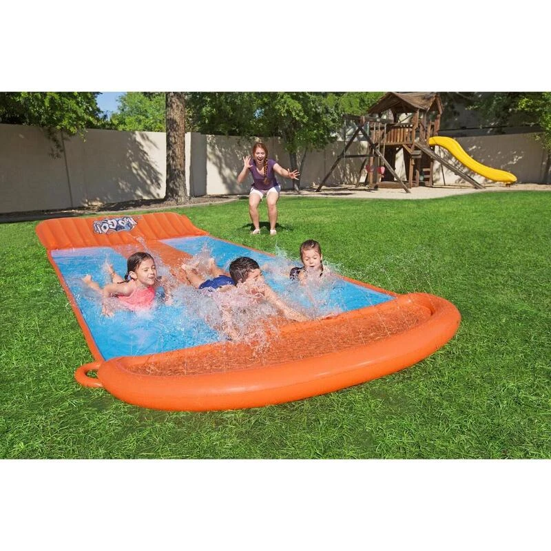 Triple glissièreAvec rampe au débutFacile à connecter au tuyau d’arrosageFait de vinyle de 0,22/0,20 mmÂge : 3+Longueur : 549 cmIncluant patch de réparation