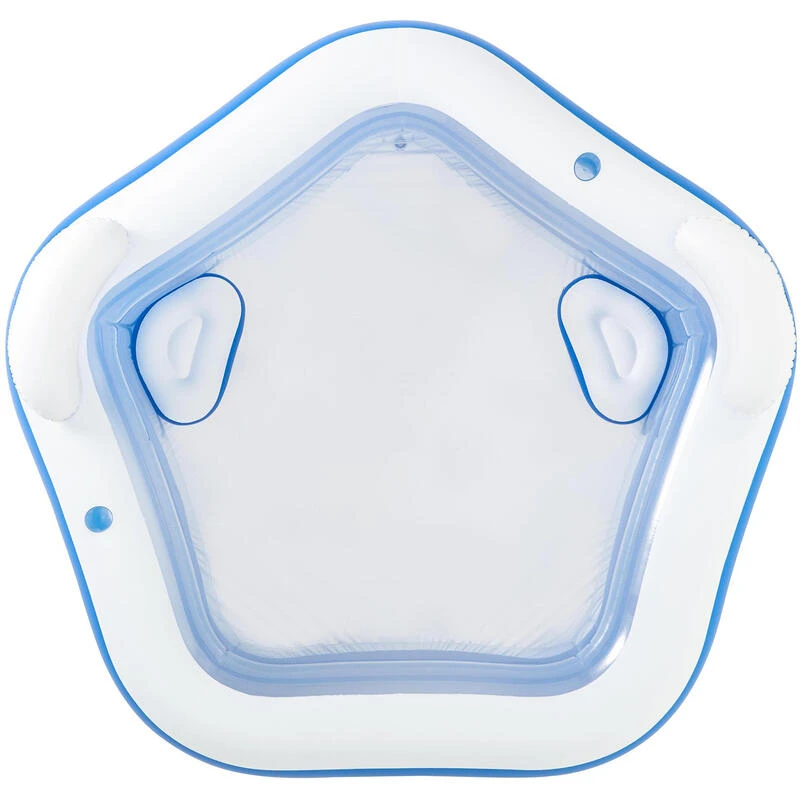 *Piscine familiale gonflable pentagonale *Longueur : 213 cm *Largeur : 206 cm *Hauteur : 69 cm *Capacité d’eau : 575 litres *Âge recommandé : à partir de 6 ans *Deux appuis-tête *Deux coussins de siège *Deux porte-gobelets intégrés *Deux anneaux d’air *Valve de sécurité *Valve de ventilation *Côtés extra-larges *Matériau : vinyle robuste de 0,27 mm d’épaisseur *Valve de vidange *Kit de réparation inclus *Couleur : bleu et blanc *Marque : Bestway